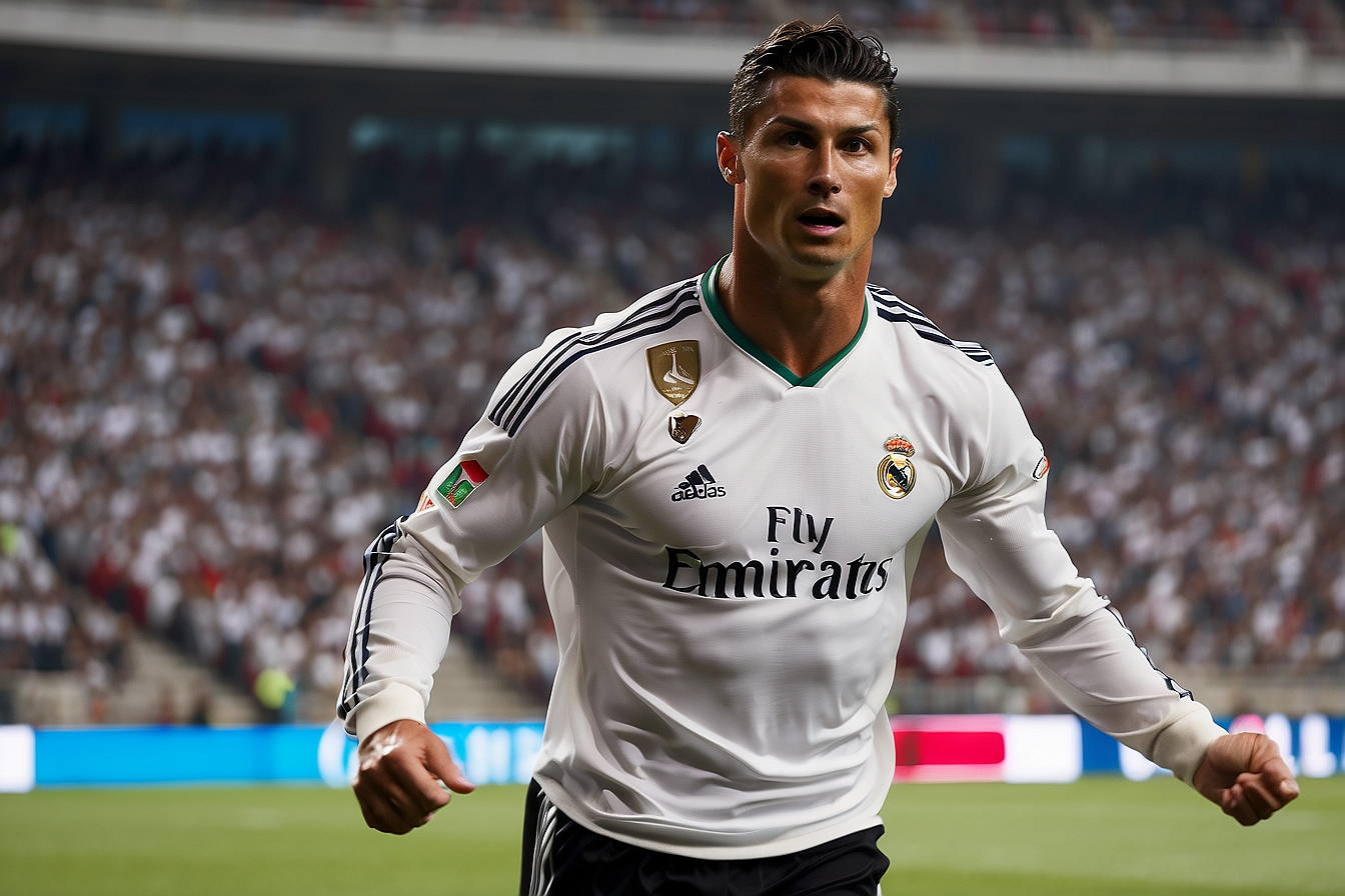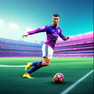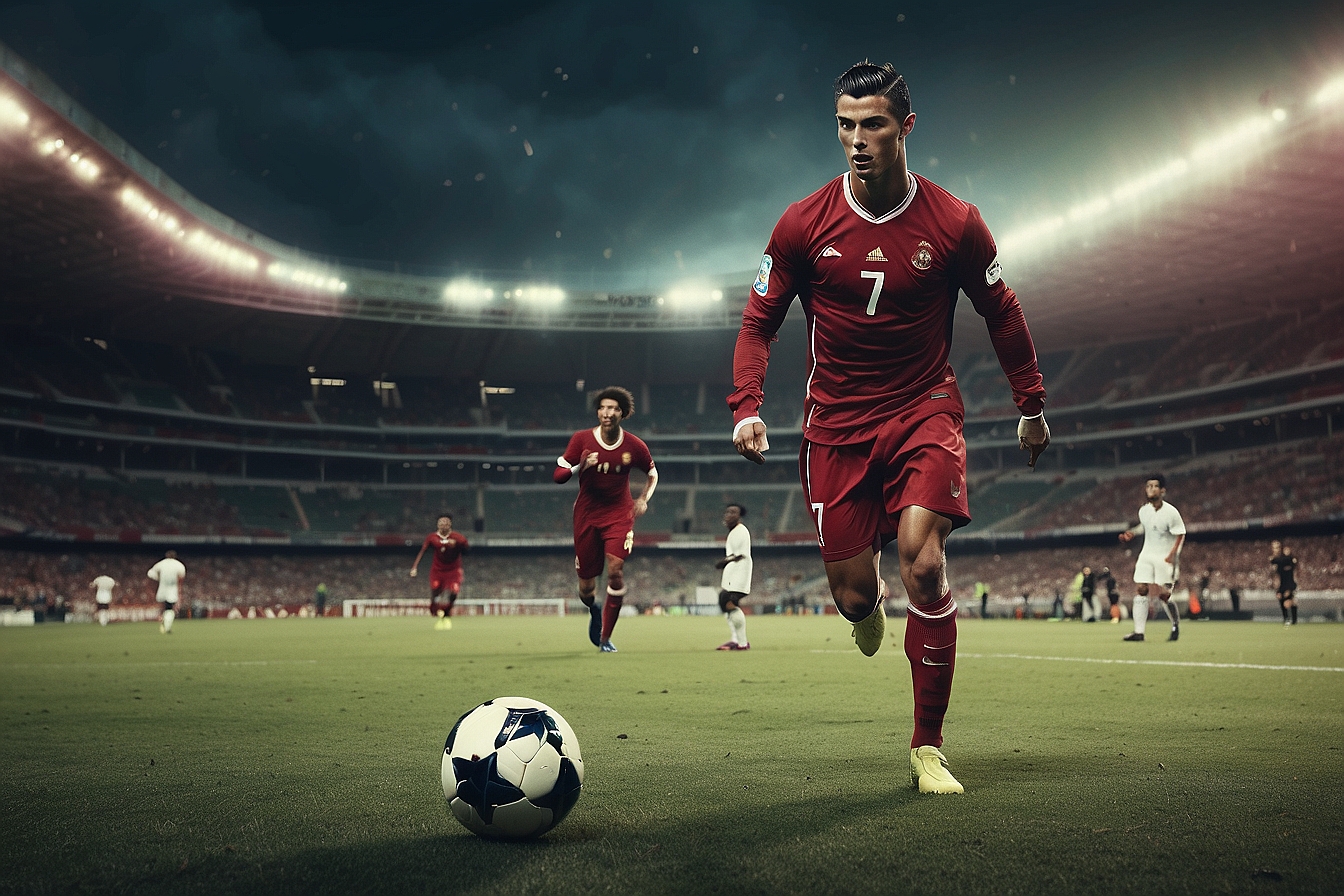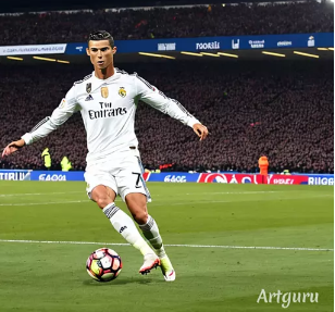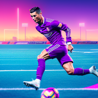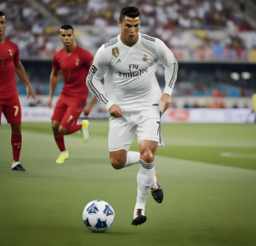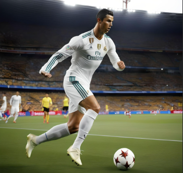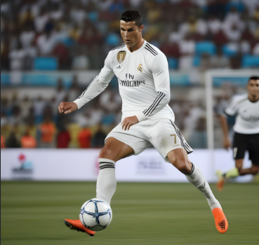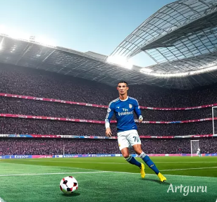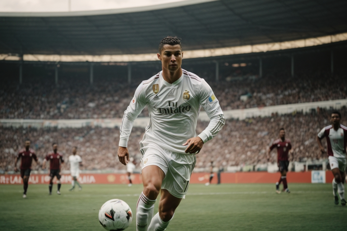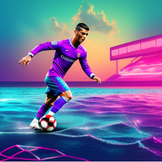 Cristiano Ronaldo jugando a futbol en un estadio de futbol en medio del mar mientras mete un golazo
